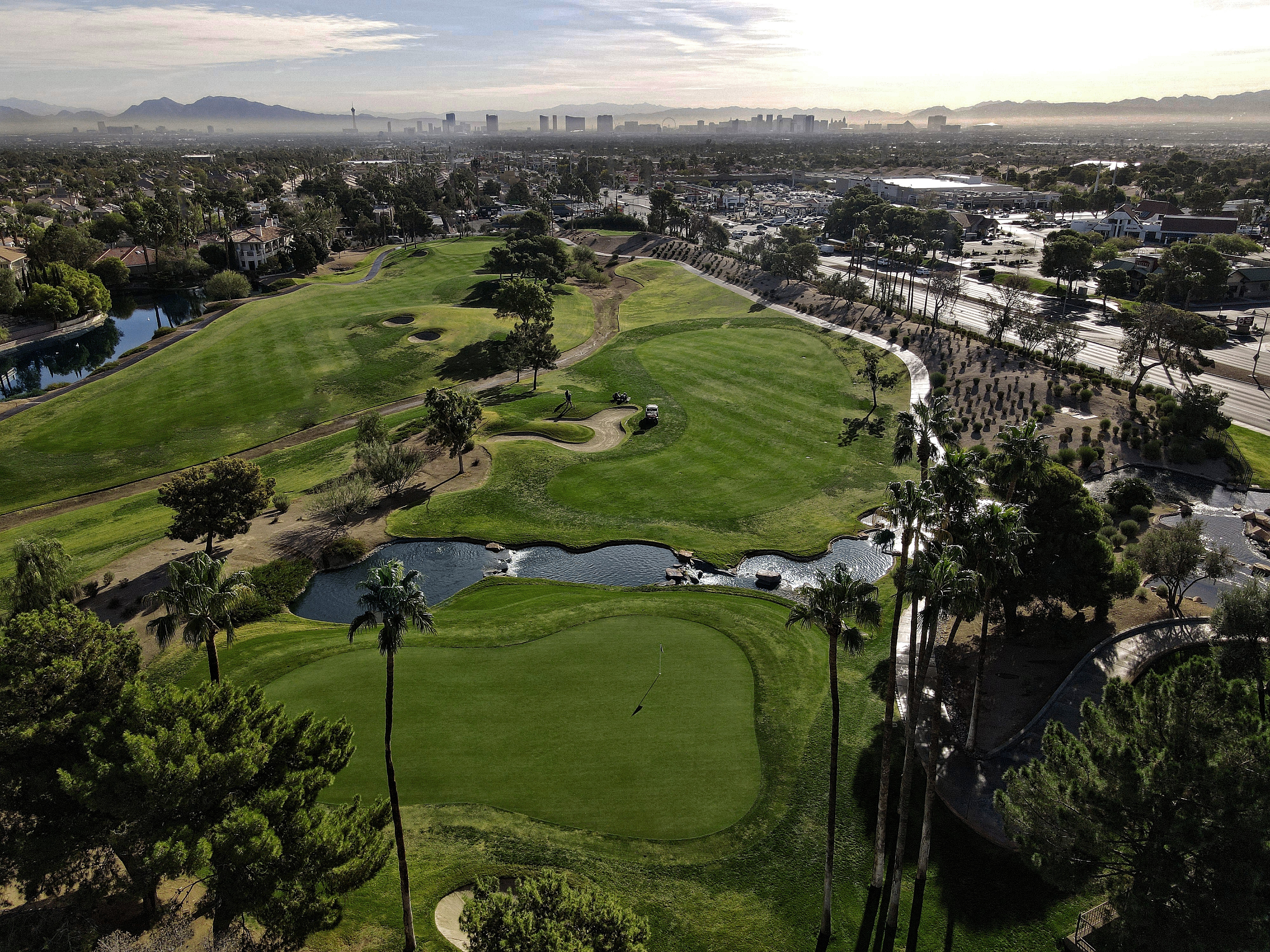 The opening hole at Canyon Gate is a long par 5. Off the tee, players can grip it and rip it, but must be careful to avoid the water on the …