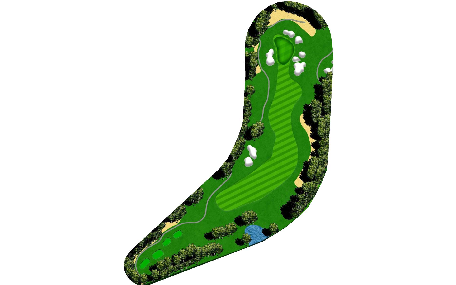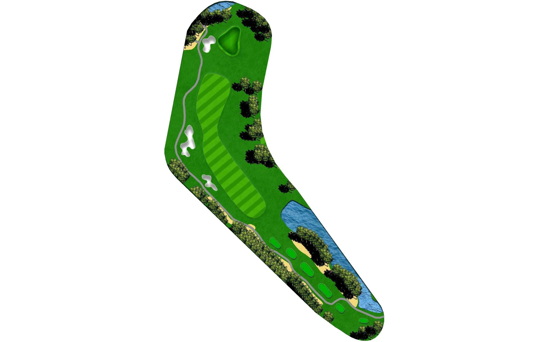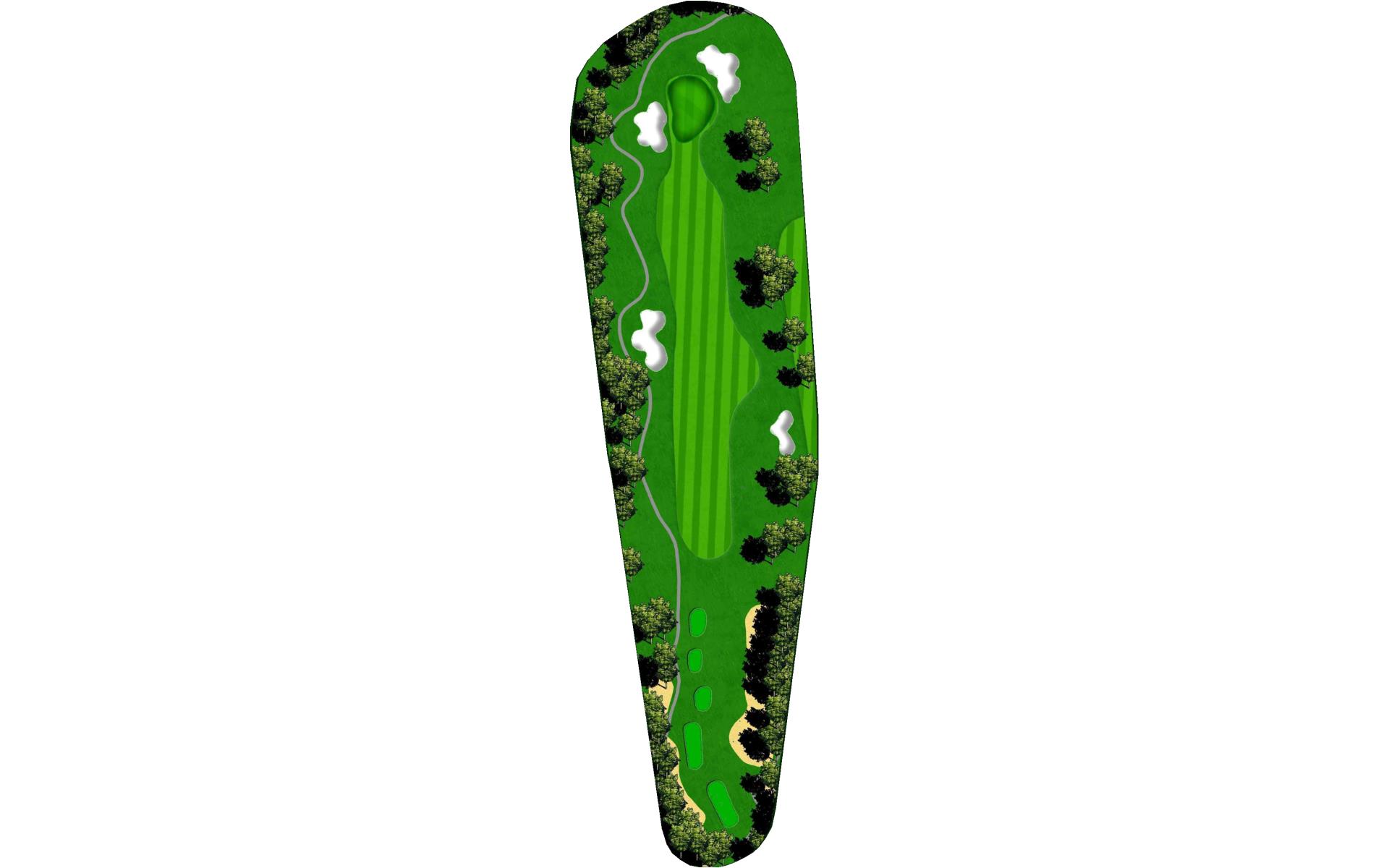 This double dogleg par 5 is reachable in 2 if you challenge the left fairway bunker and trees off the tee. You will have to shape your second shot around a few well placed trees to get an eagle chance.