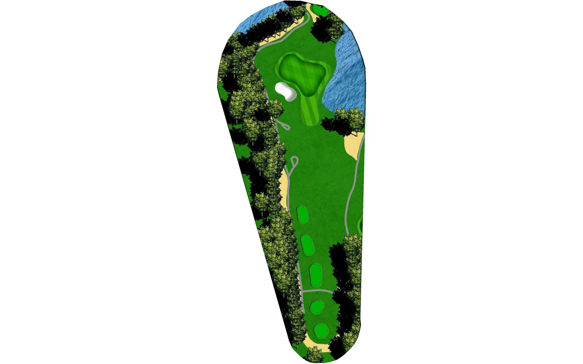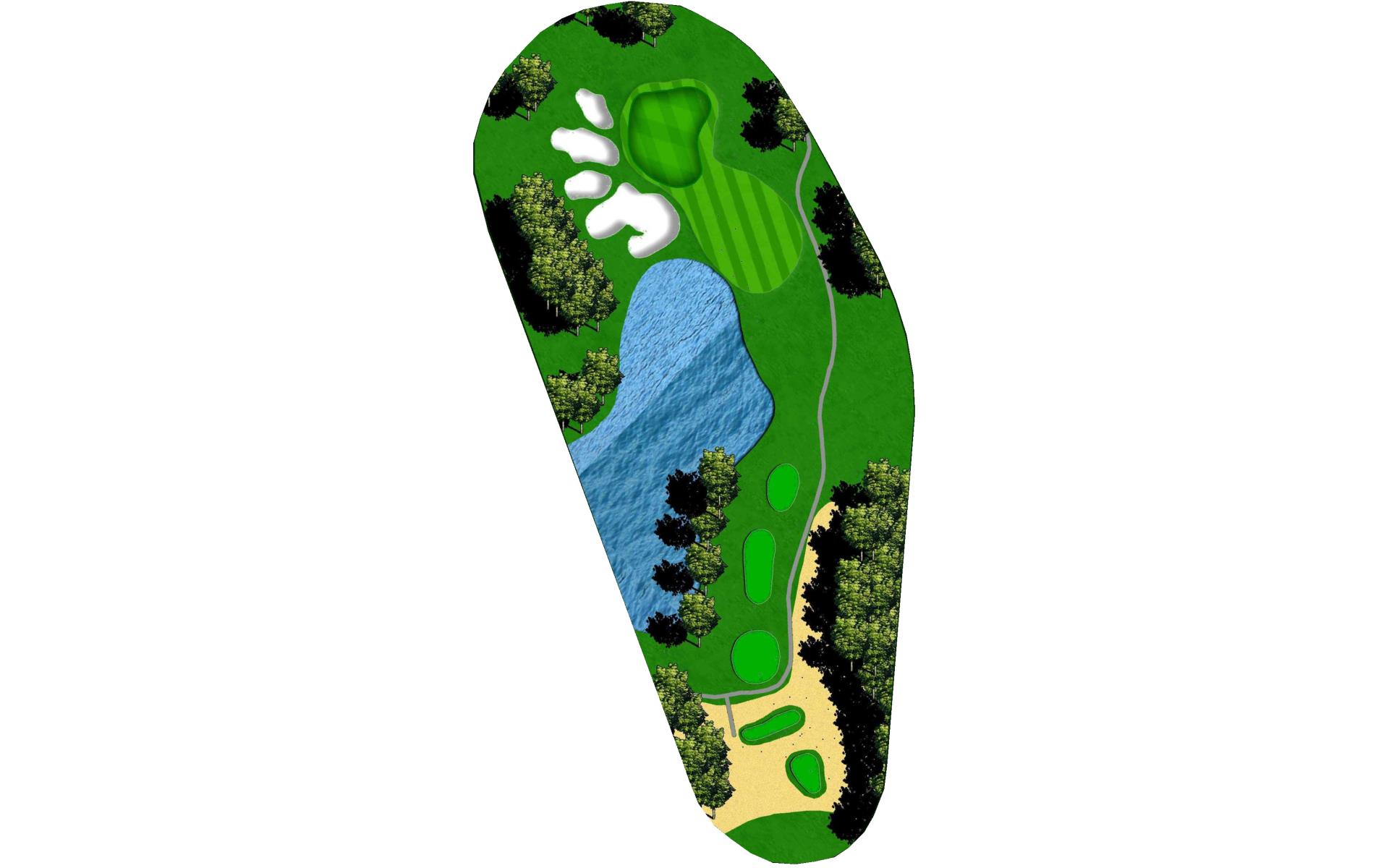 This downhill par 3 is protected by the lake on the right and a bunker in front of the back to front sloped green.