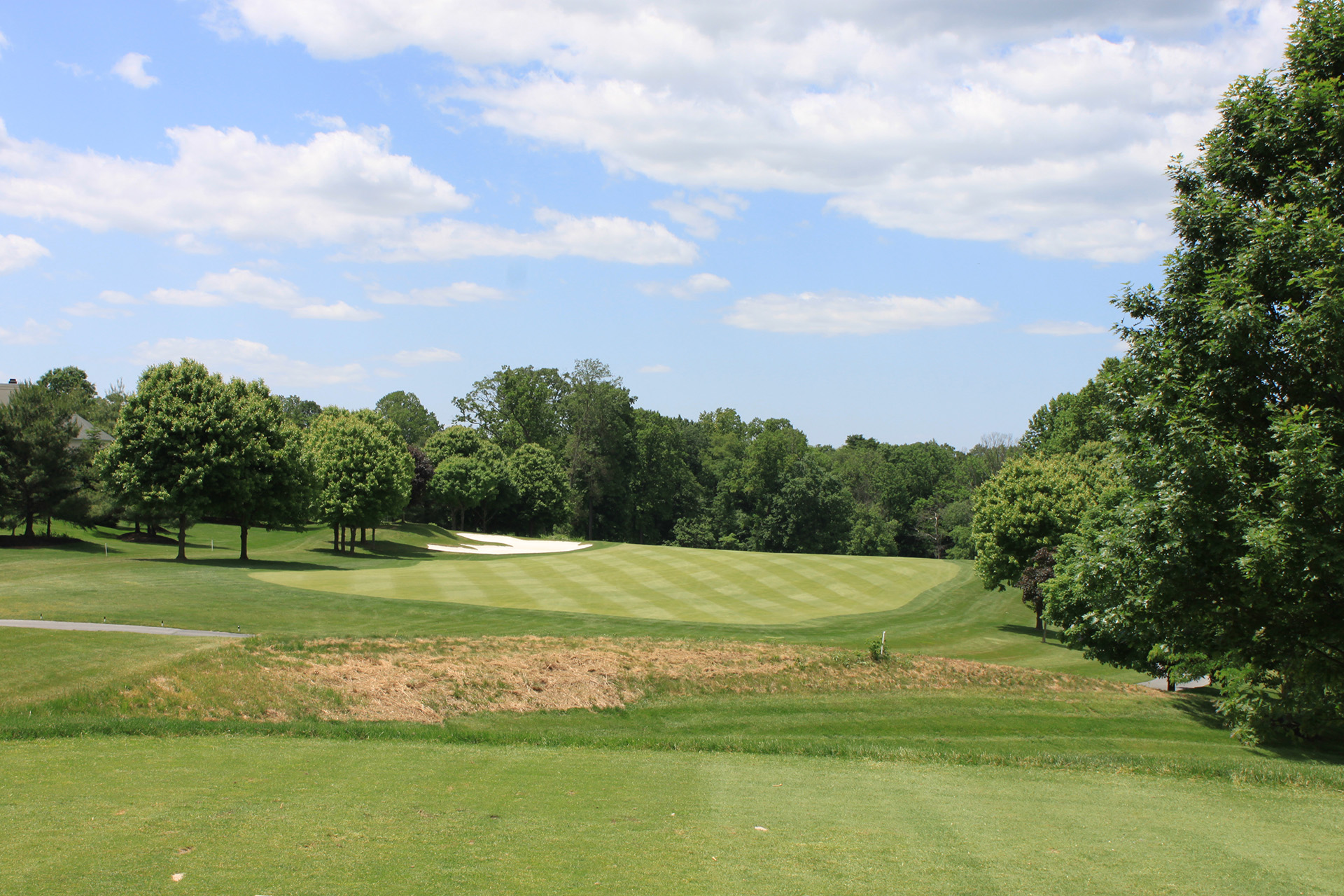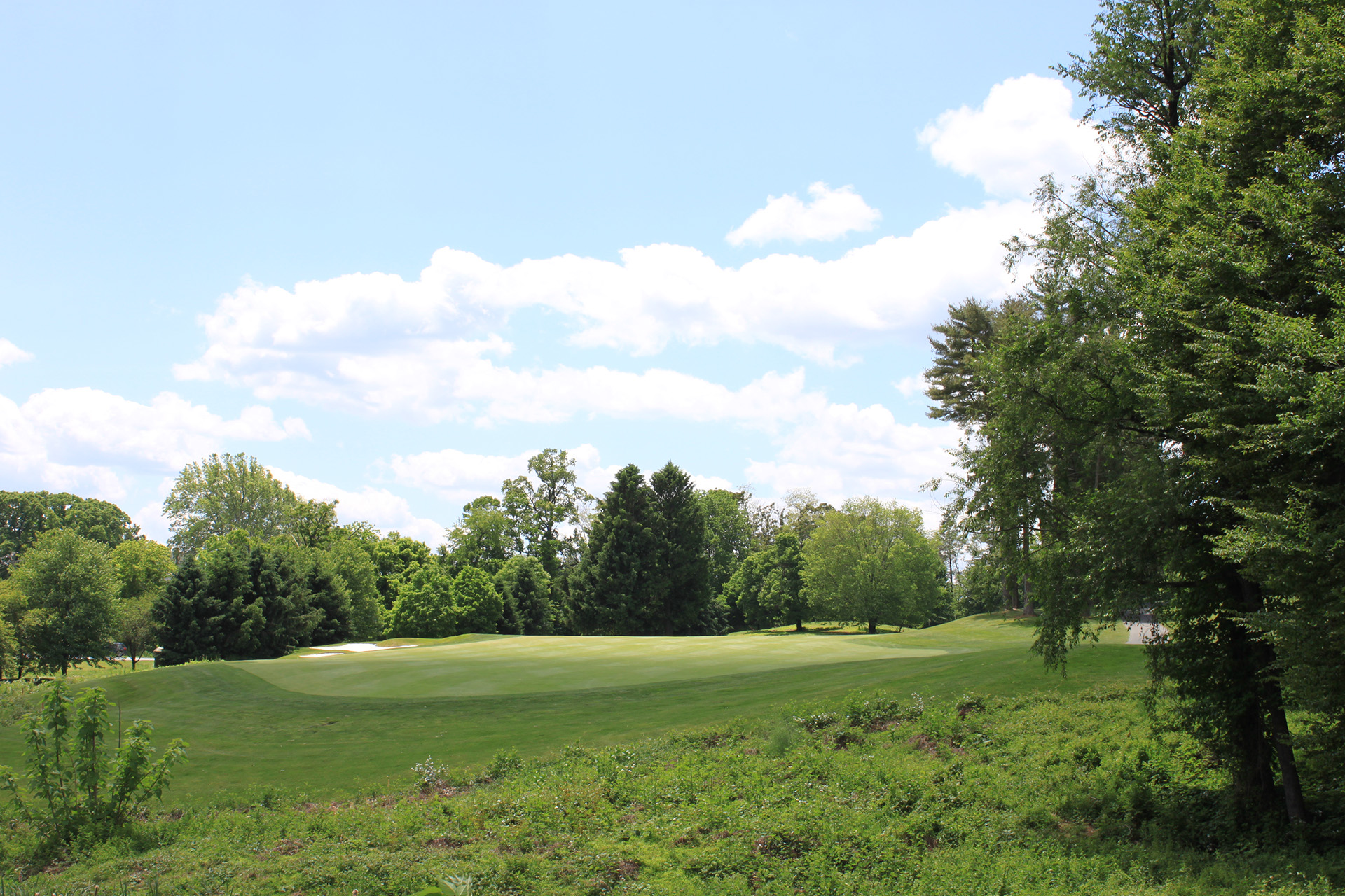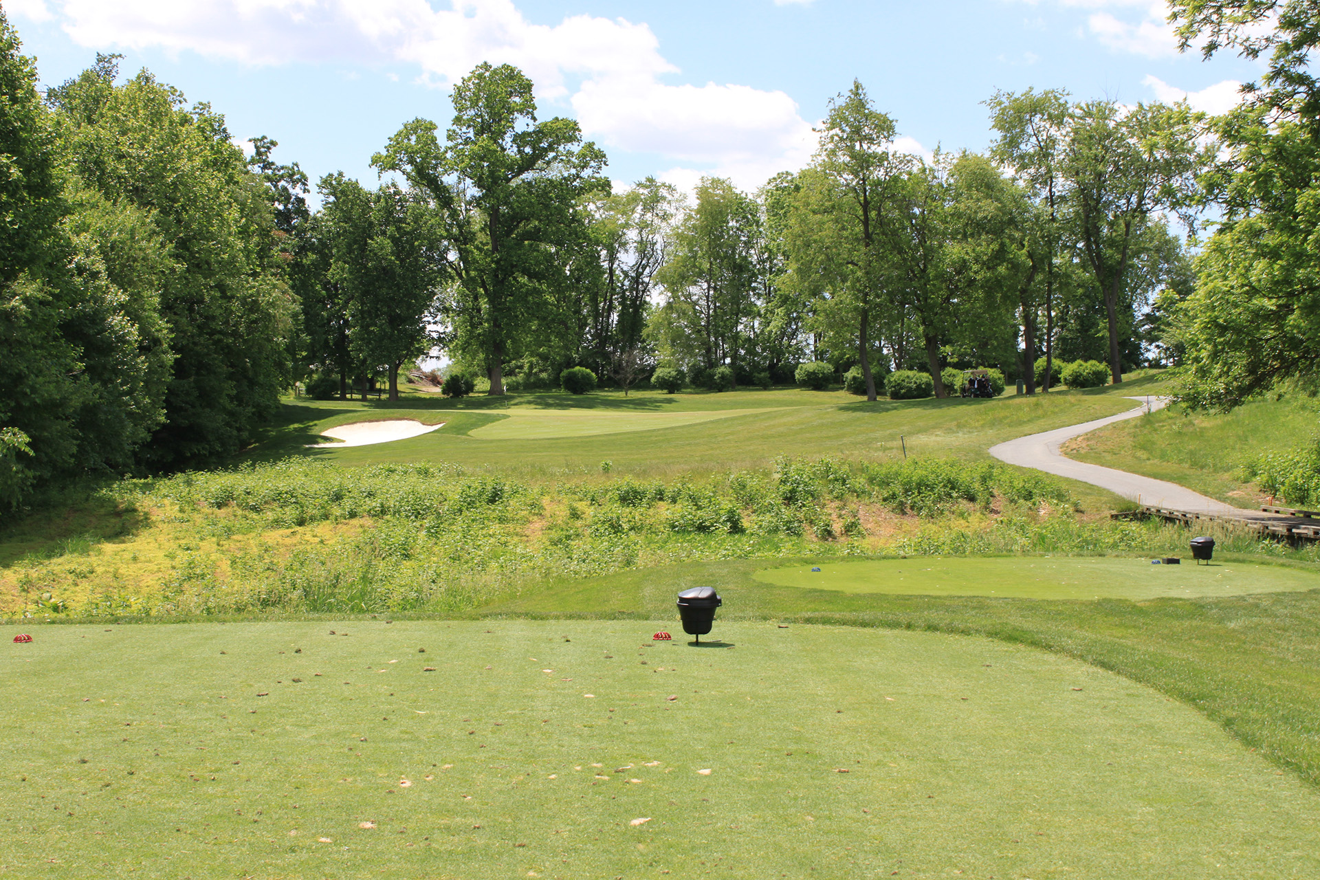 A short par 5 that doglegs slightly to the right around a grove of tall trees. Hitting the green in two requires two precise shots into a wide, but two-tiered green.