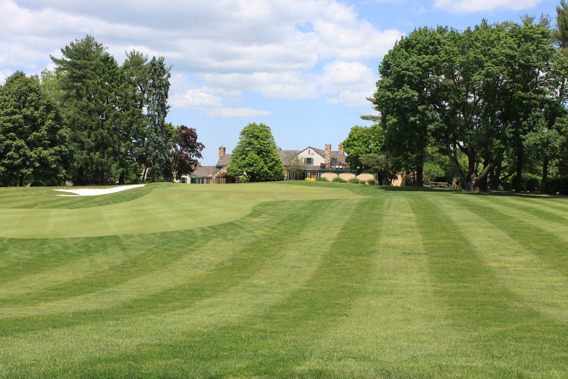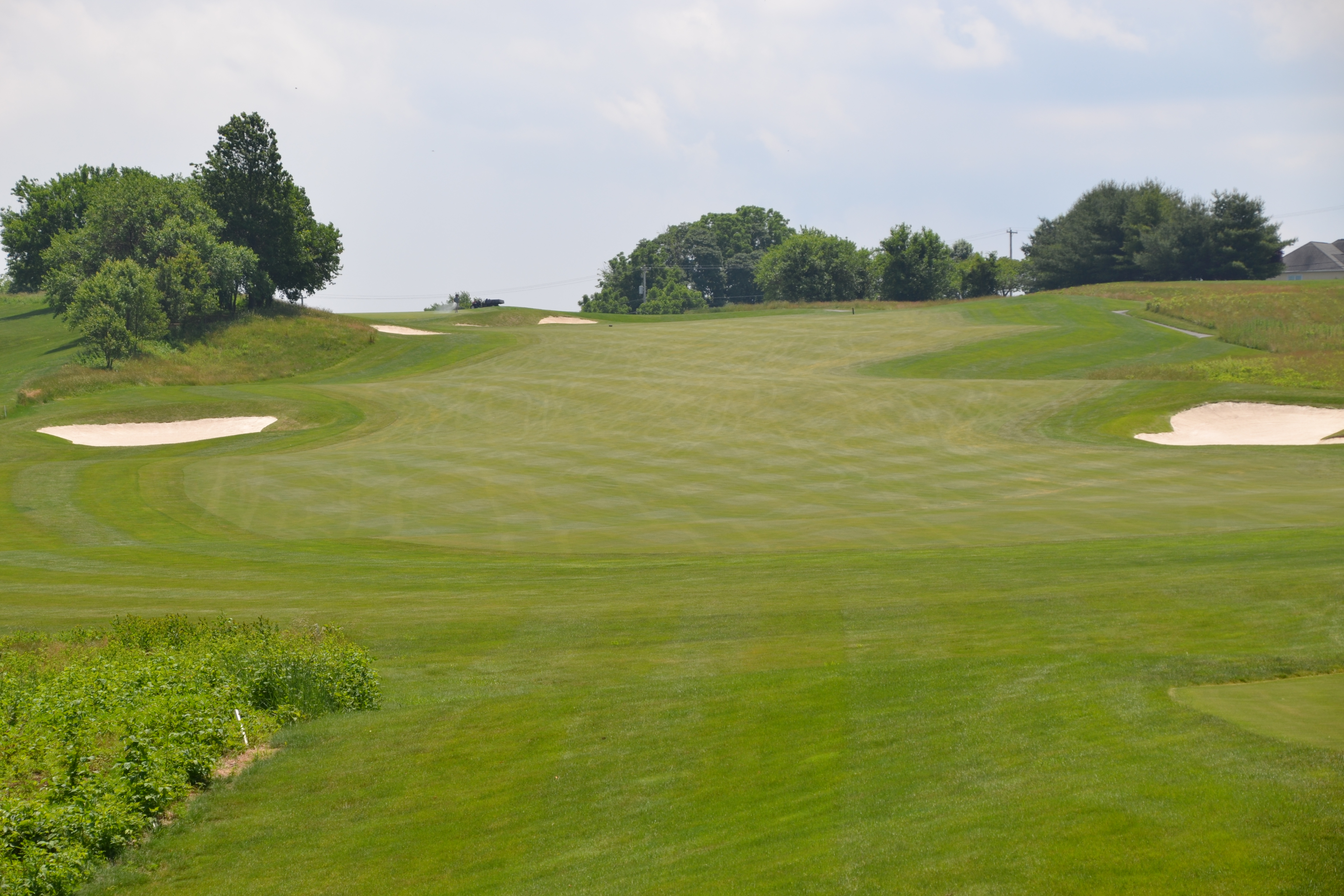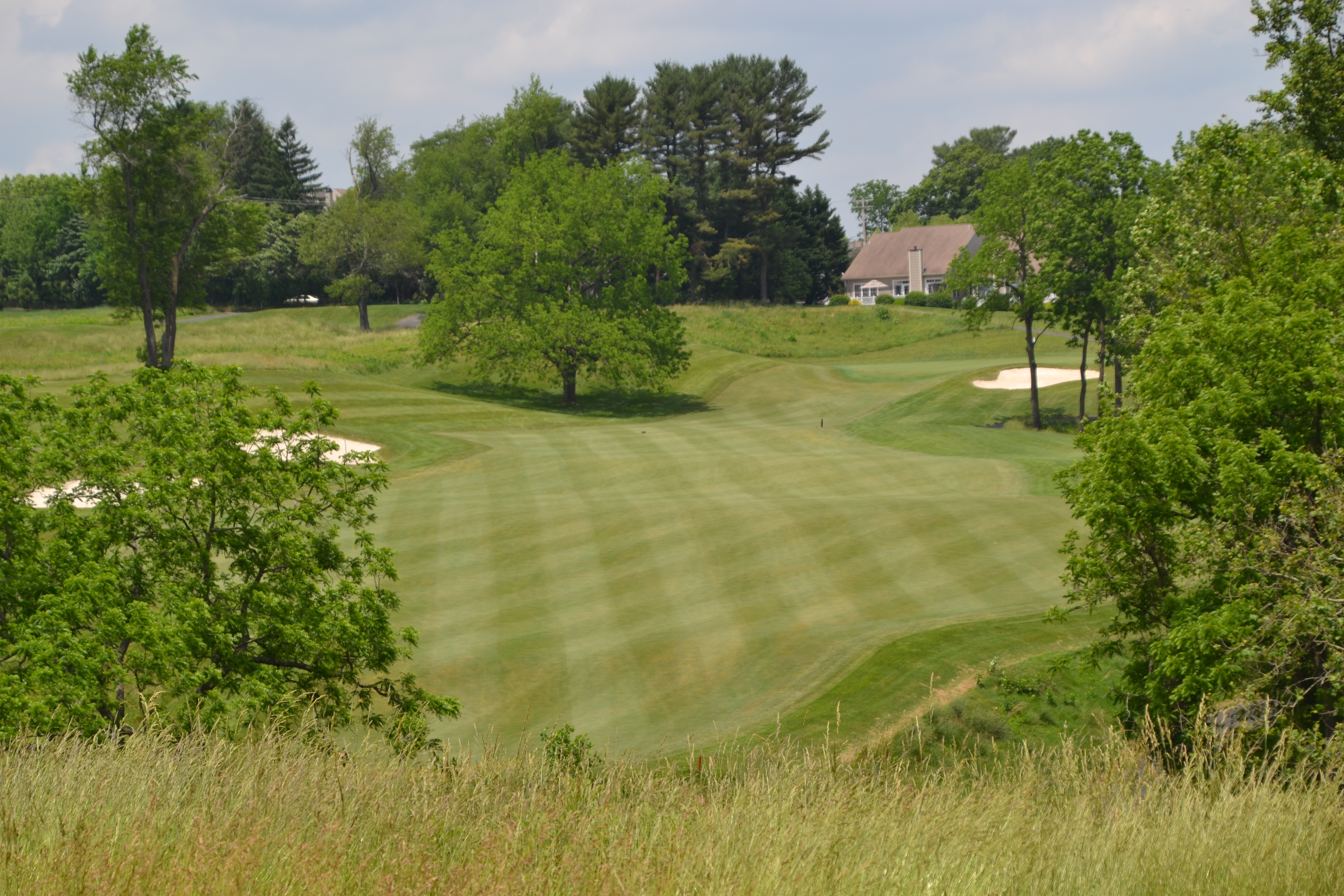 A short par 5 that doglegs slightly to the right around a grove of tall trees. Hitting the green in two requires two precise shots into a wide, but two-tiered green.