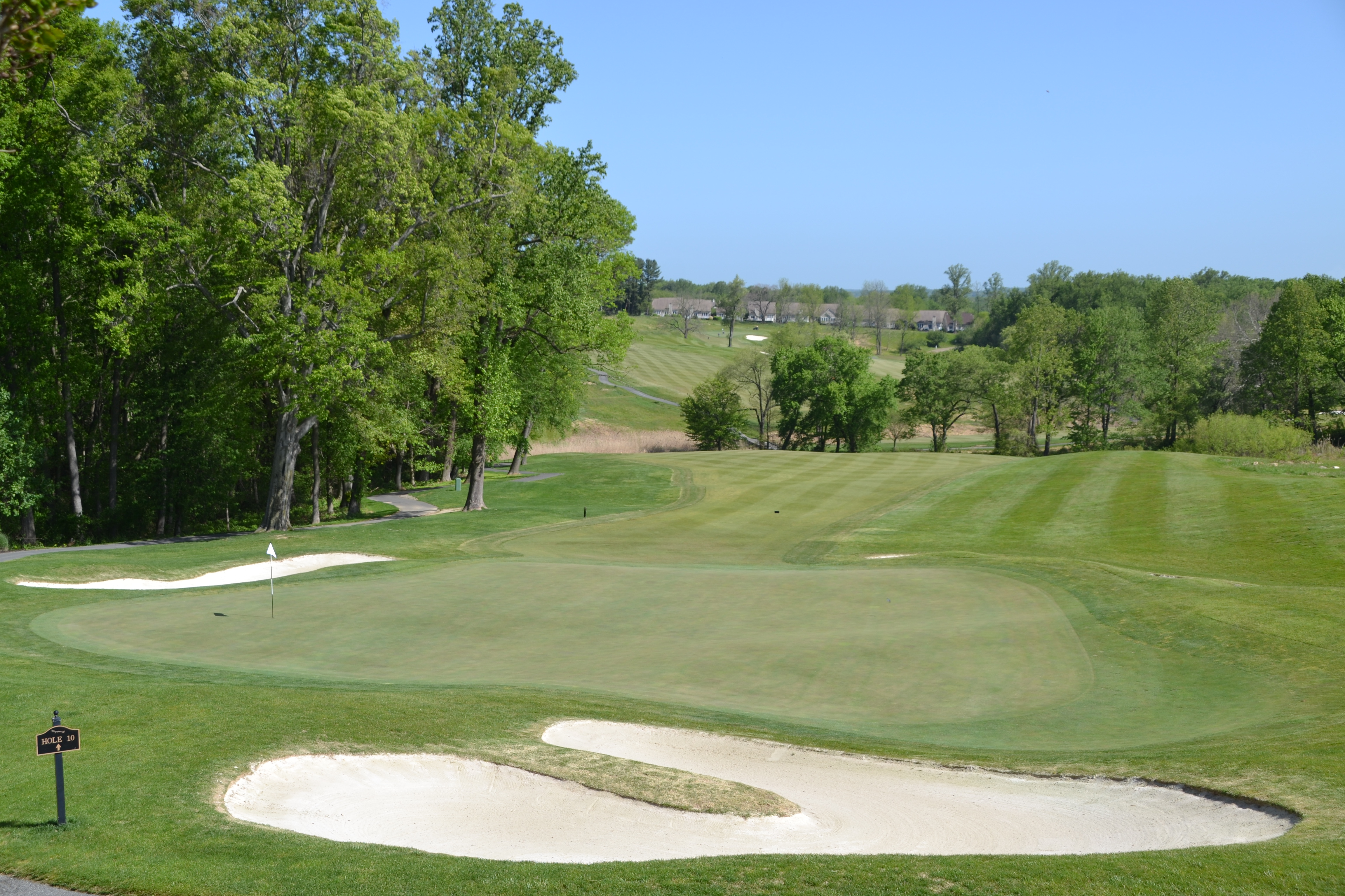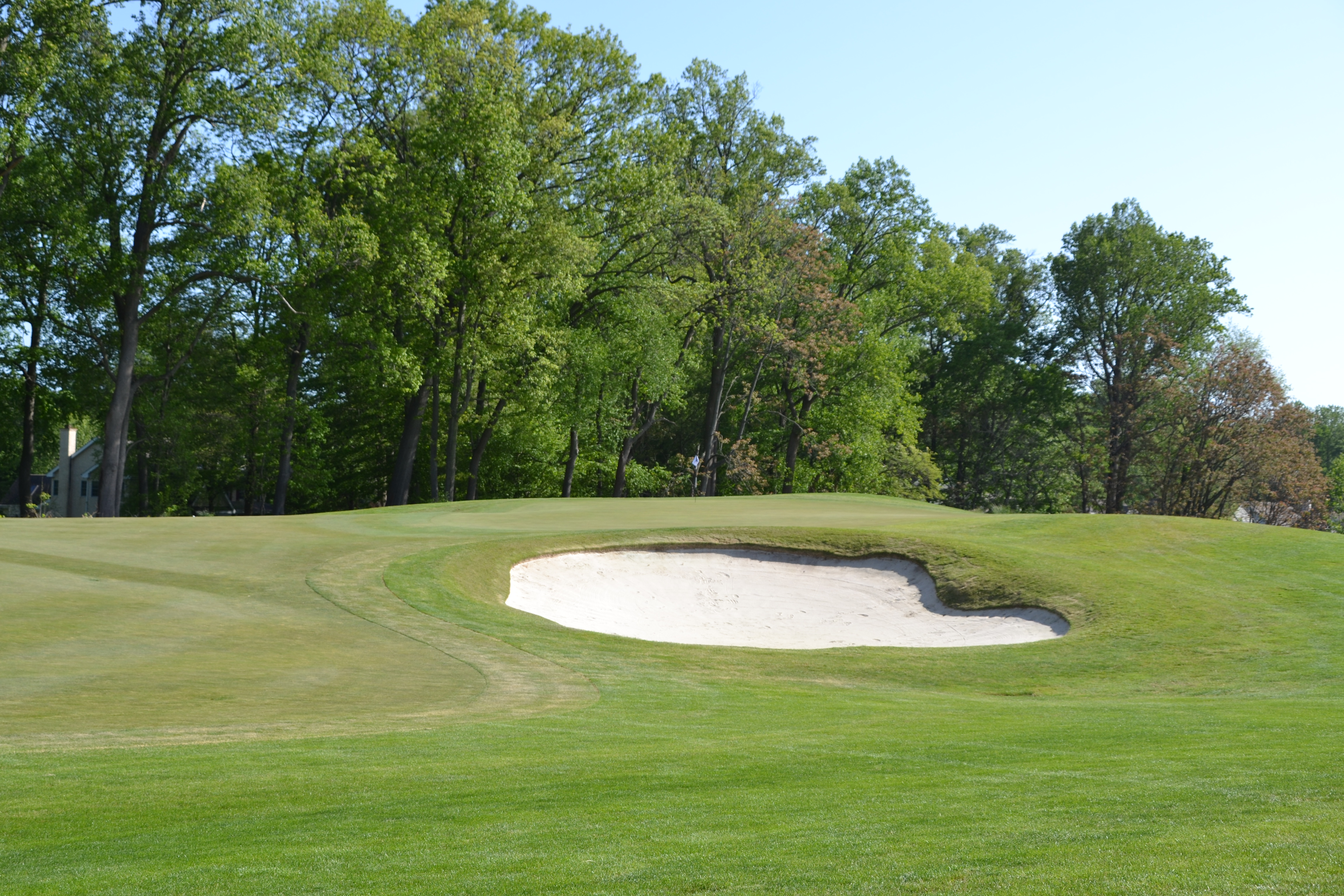 The back nine opens with a blind tee shot with trees right and a large bunker on the left. The approach shot on this par 4 plays downhill and anything left tends to kick back to the right. A deep bunker guards the putting surface on the front-right.
