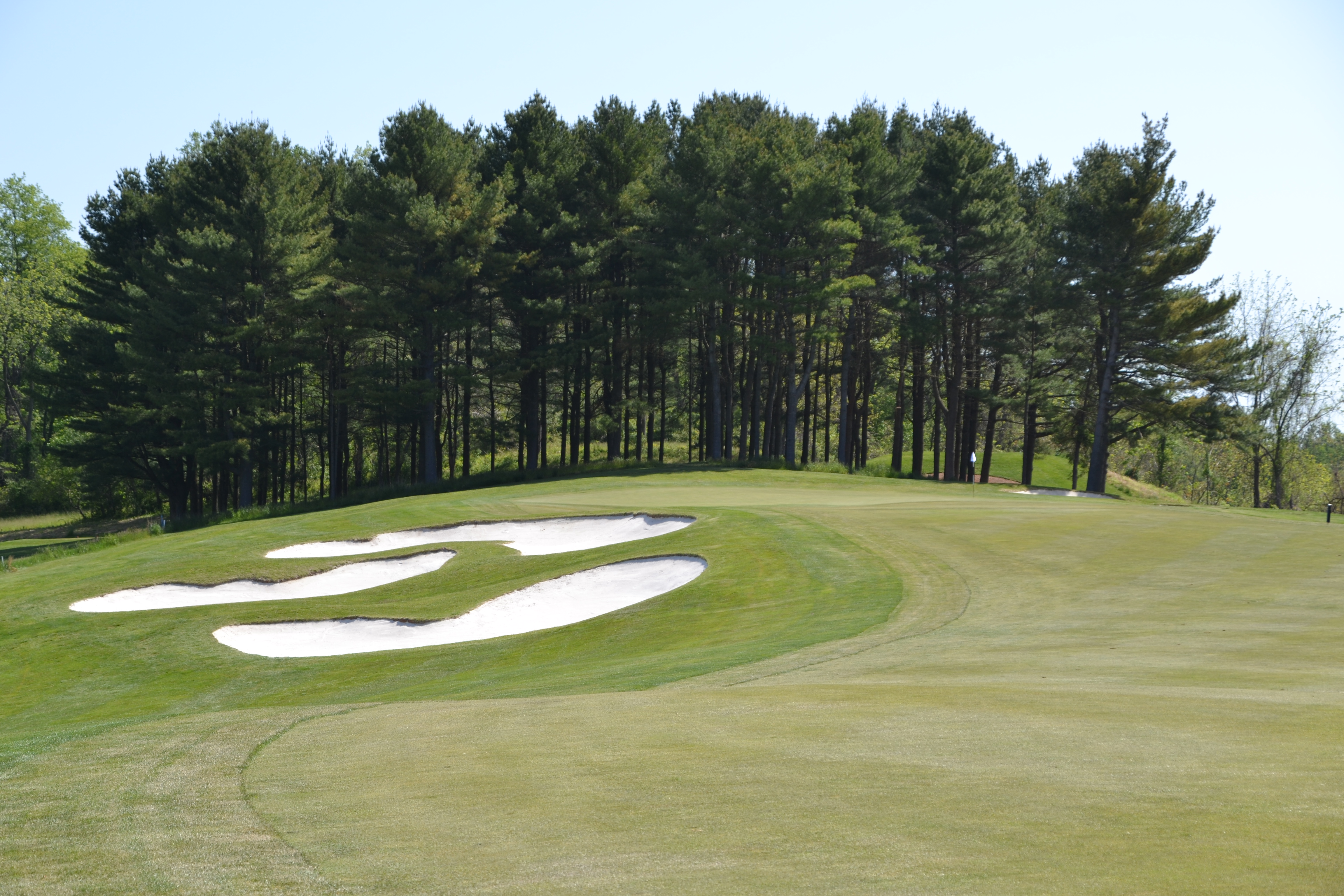 Tee shots on this finishing hole ought to be played at the American flag. This uphill, slight dogleg right par 4 features trees right and a bunker left off the tee. Then, the two-tiered green is guarded by bunkers in front.
