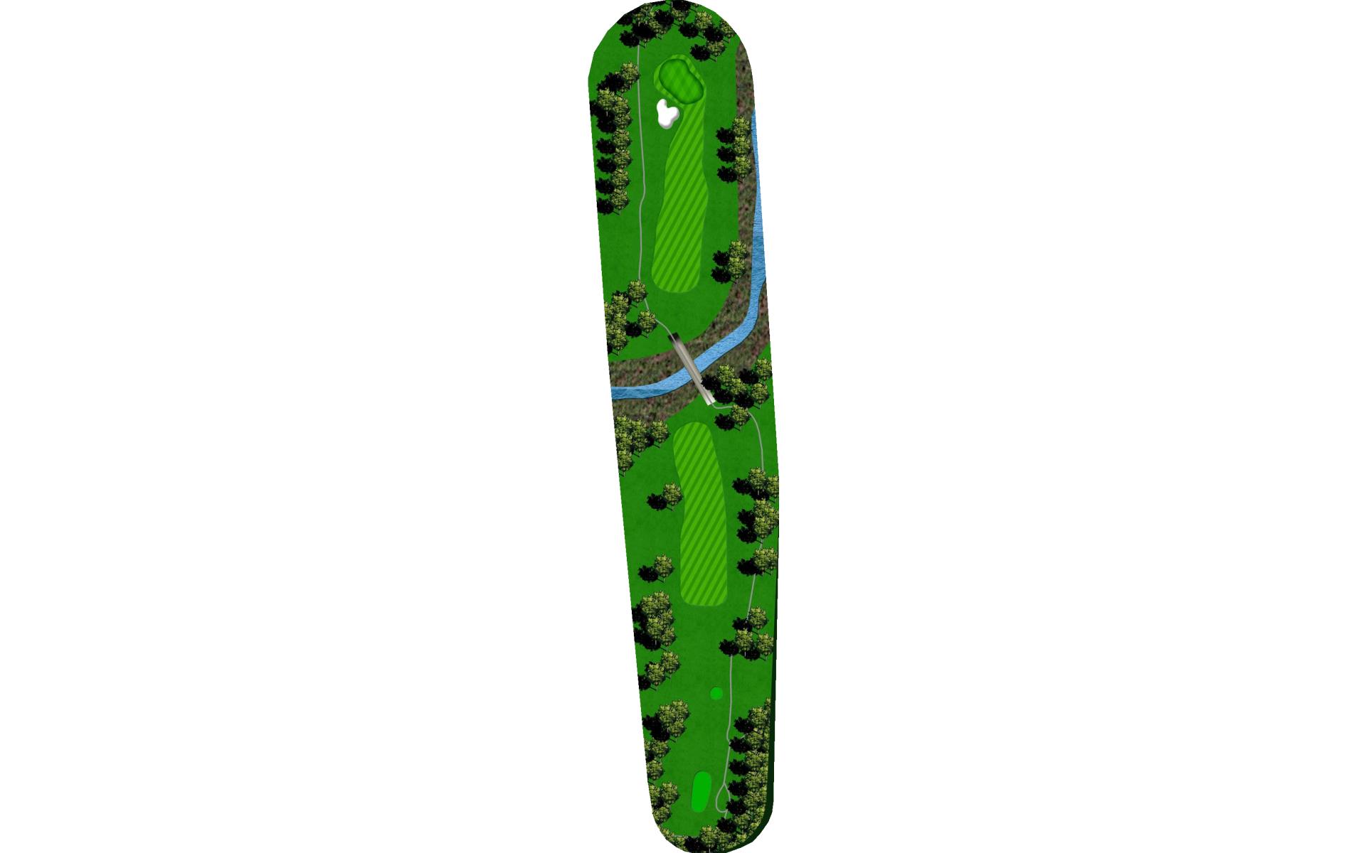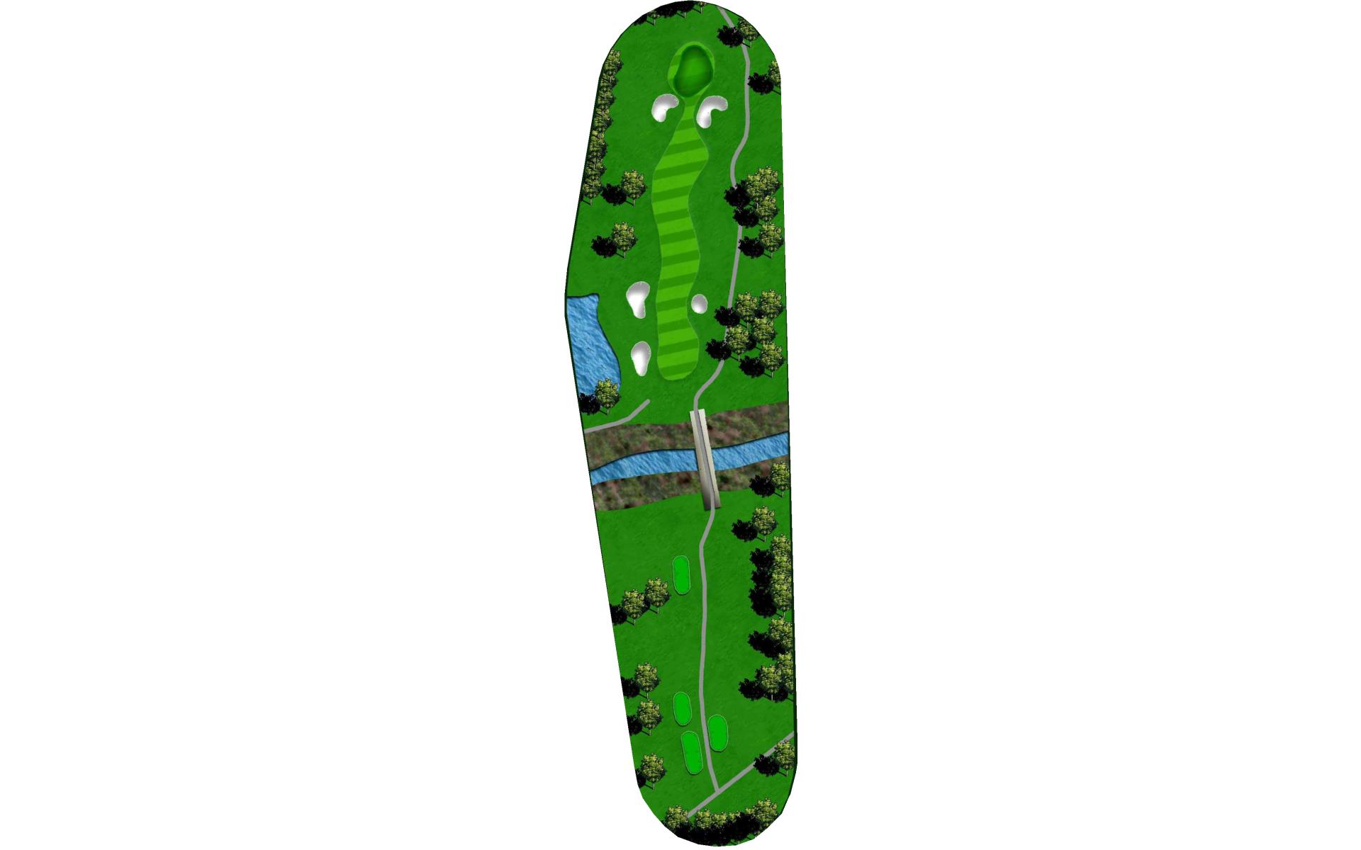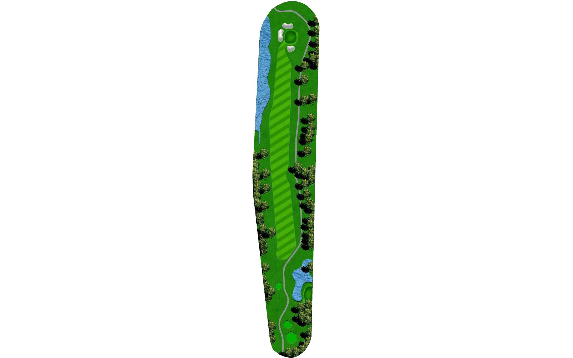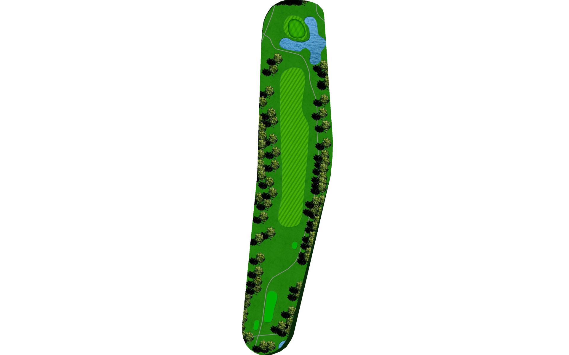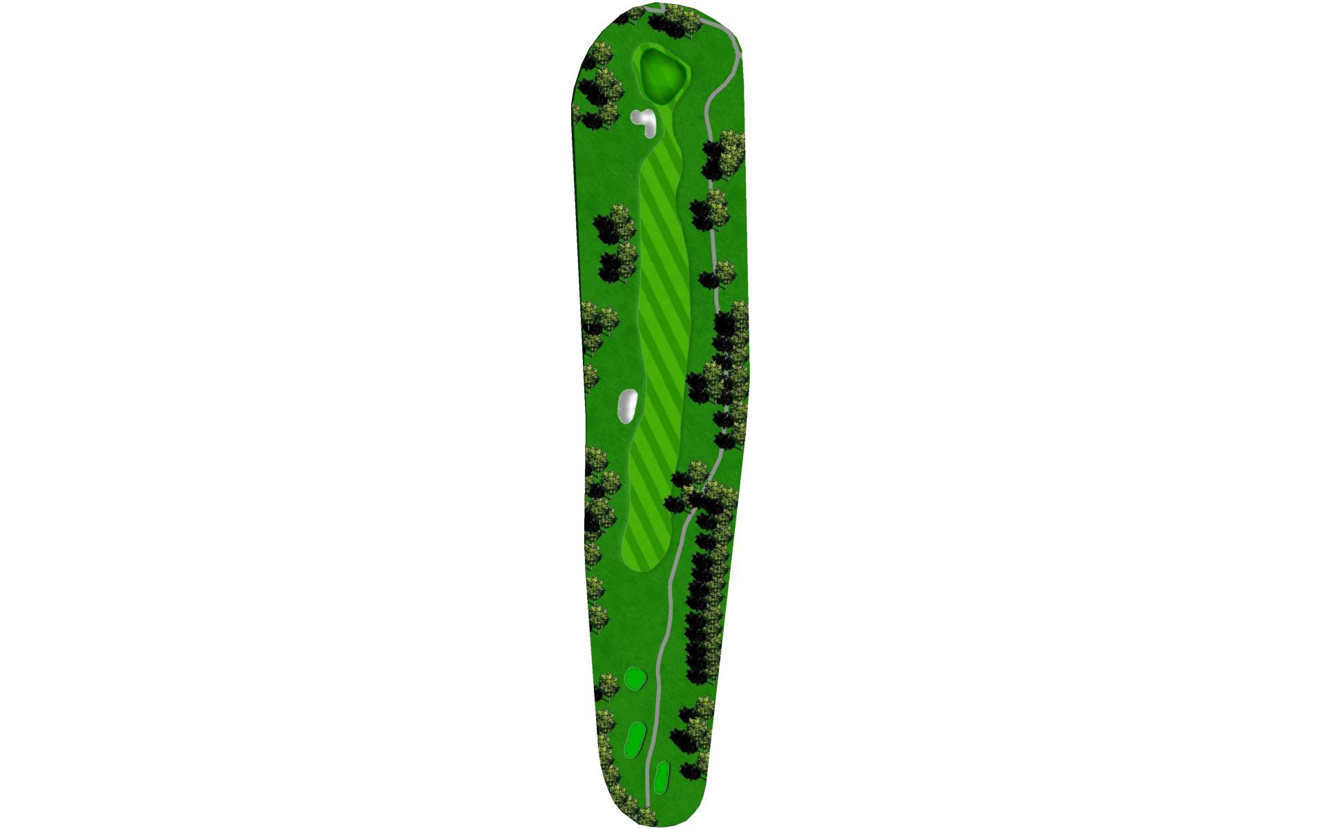 Long straight par 5 with Out of Bounds left and right. A penalty area in the left rough comes into play on the 2nd and 3rd shot. Very small green has 3 bunkers protecting it.