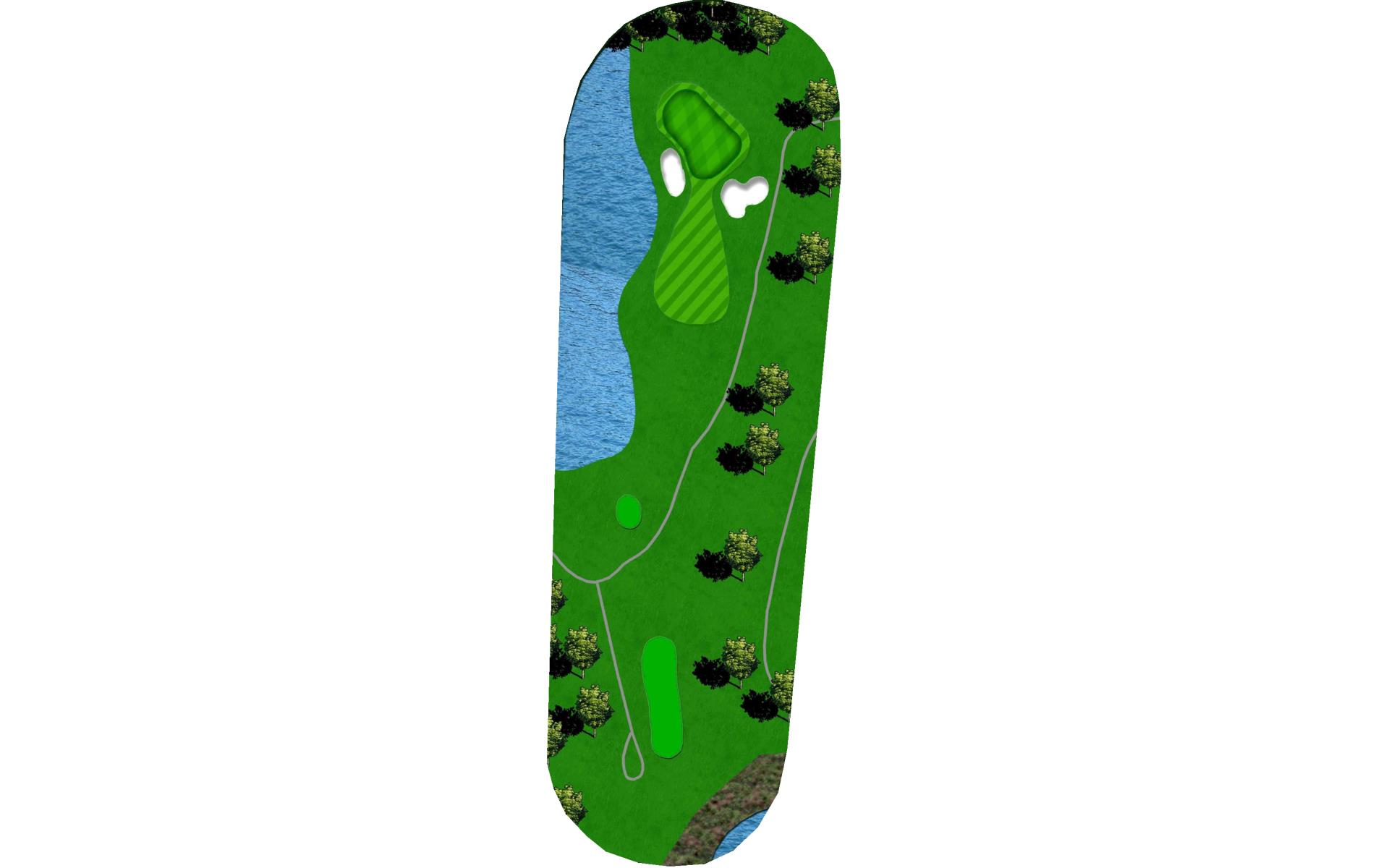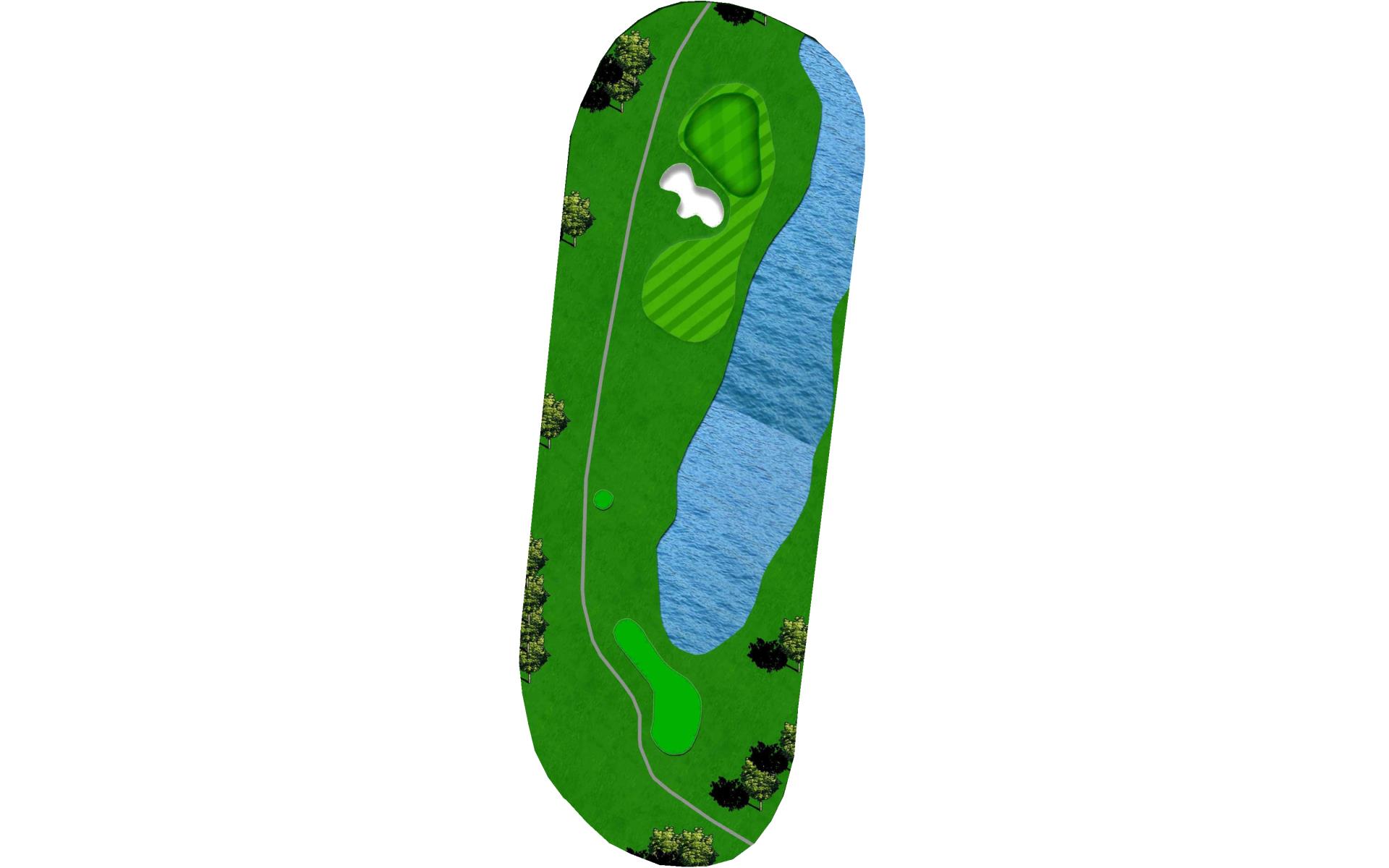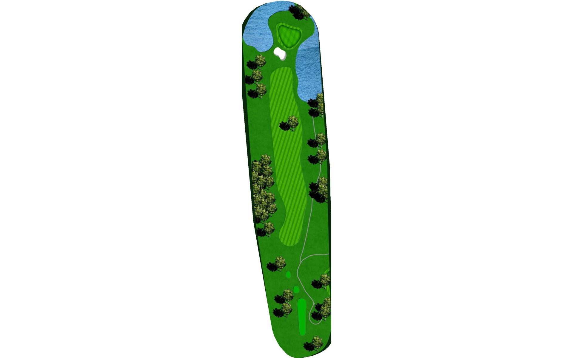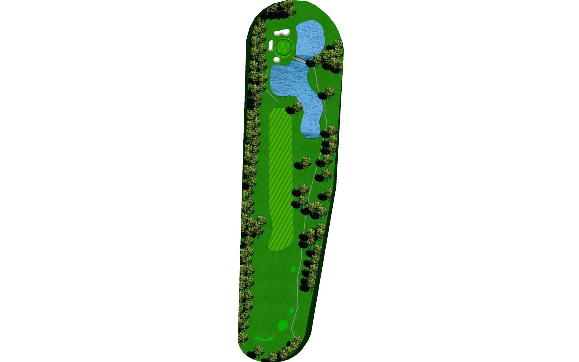 A forced carry over a penalty area crossing the fairway to a very narrow fairway. This small slightly elevated green makes a 2 putt difficult.