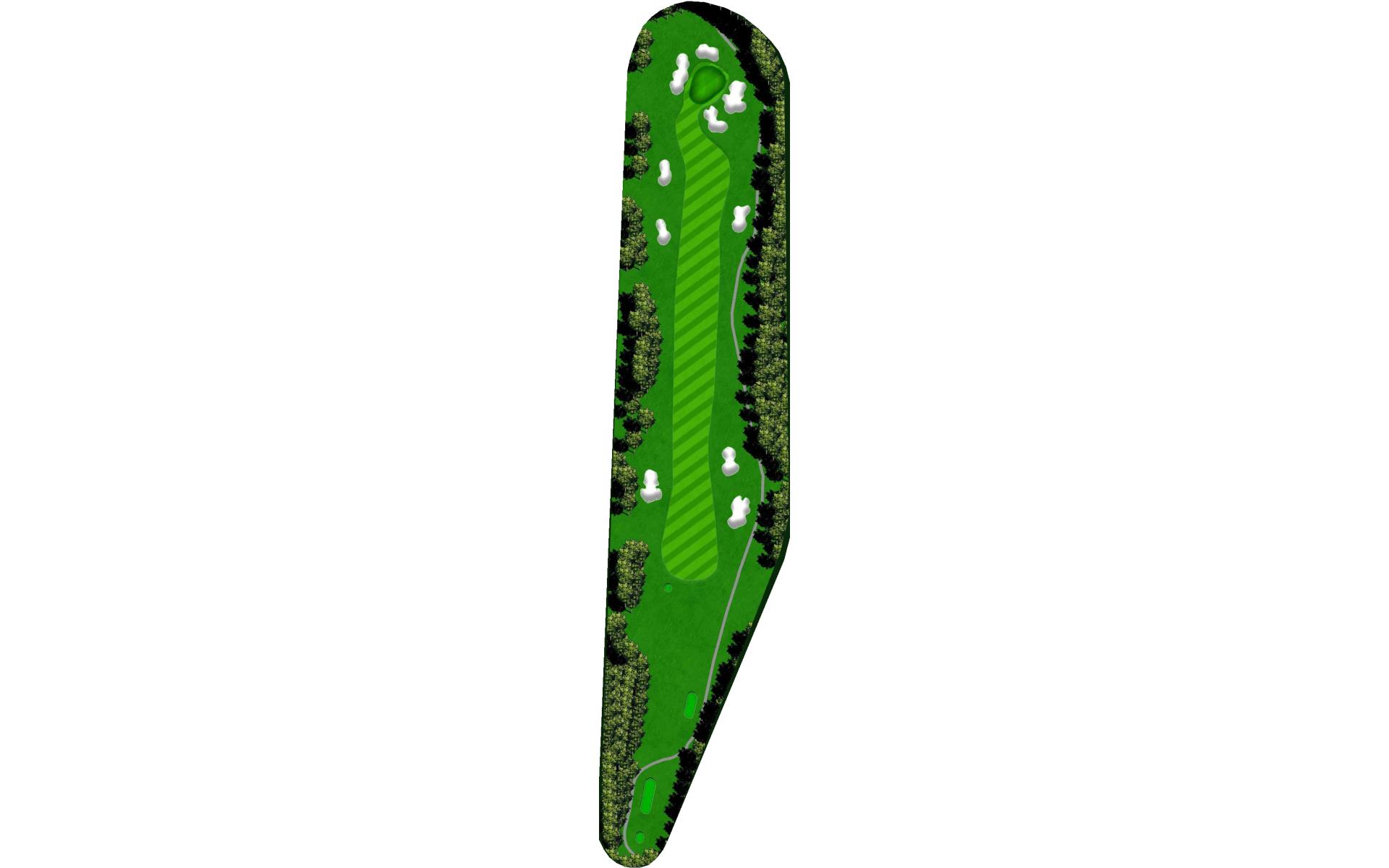Dogleg right Par 4 with out-of-bounds left and a wooded penalty area on the right. The green complex has three distinct tiers which slope from back to front.