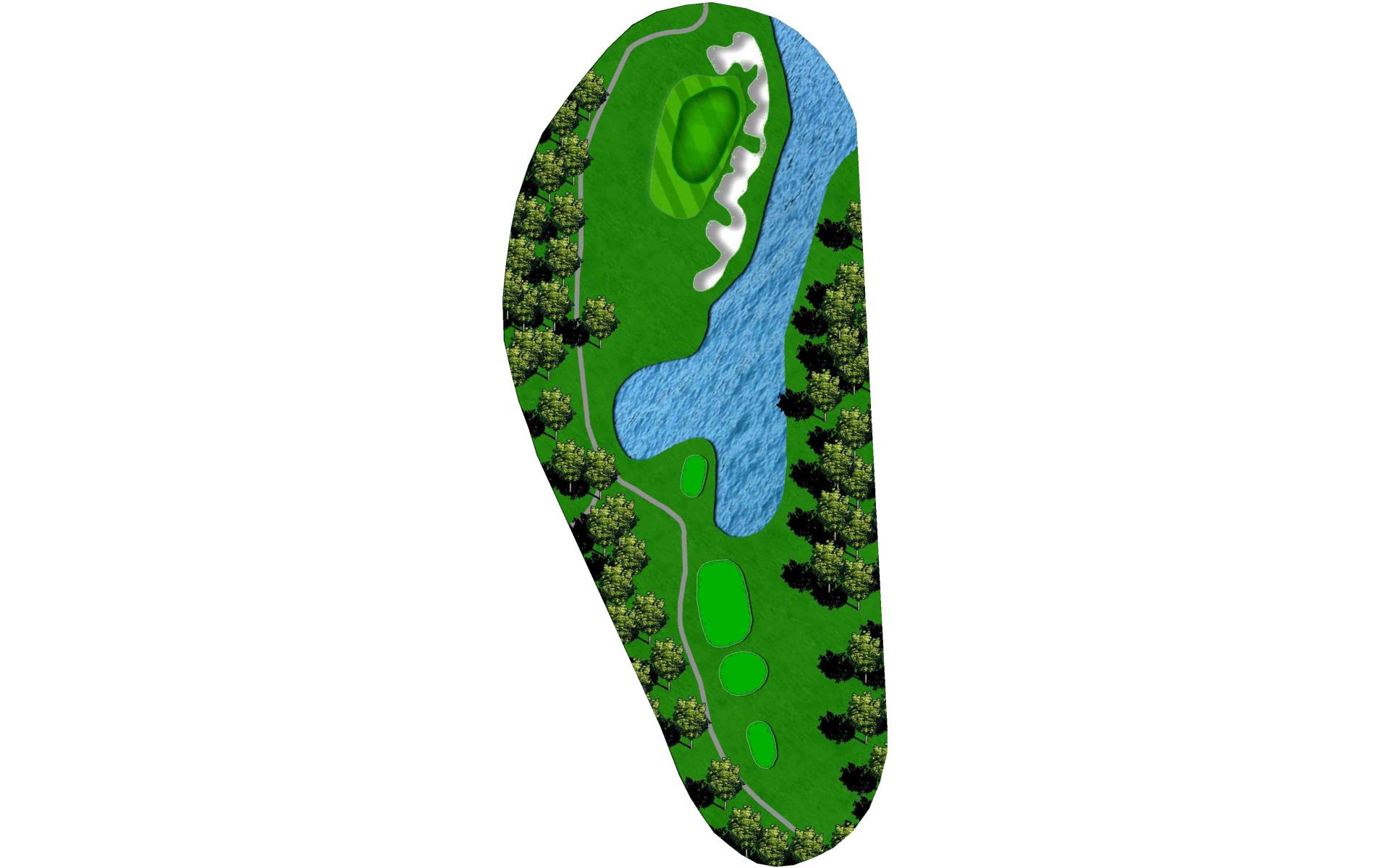 Don’t let the yardage fool you here. At 149 yards, this par three requires an accurate tee shot. A two-tiered bunker protects the right while water looms large, short and to the left.