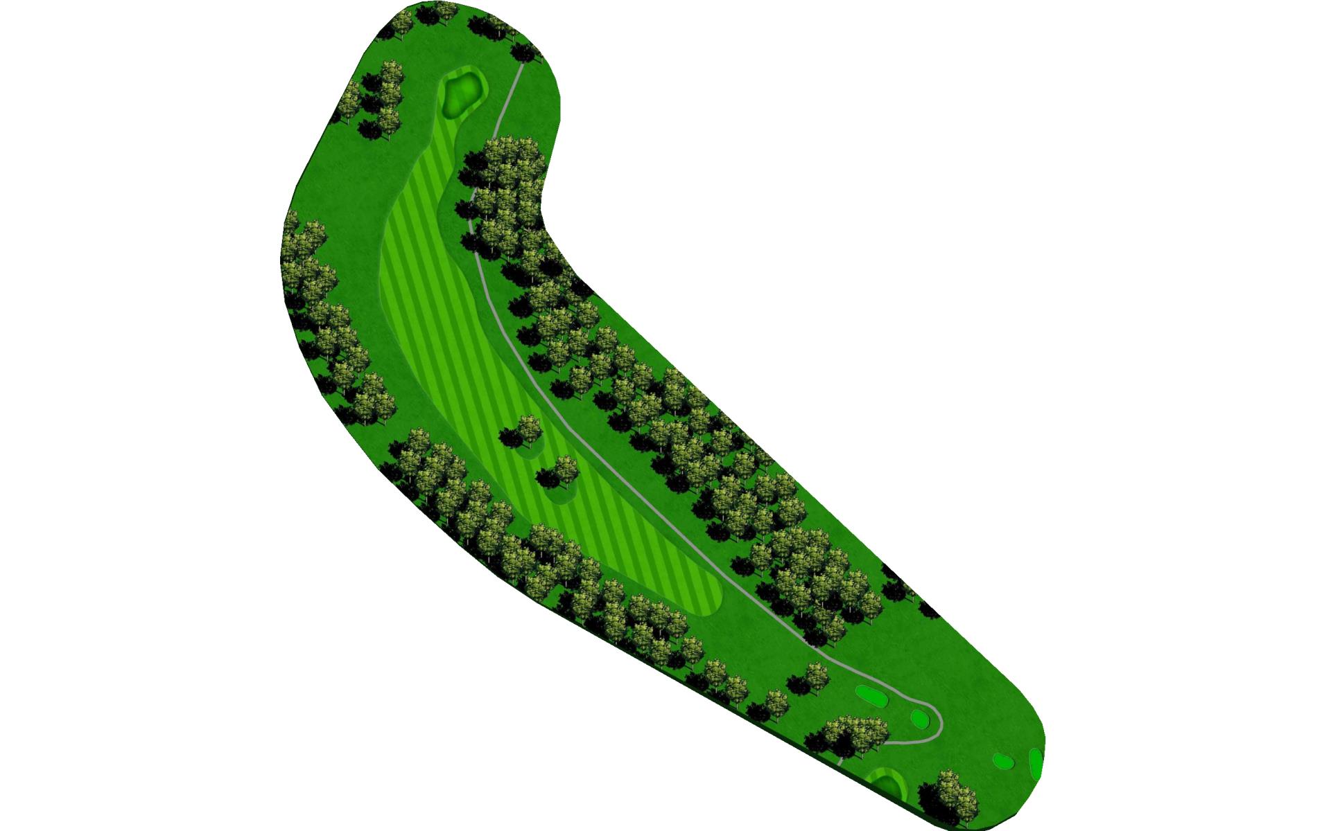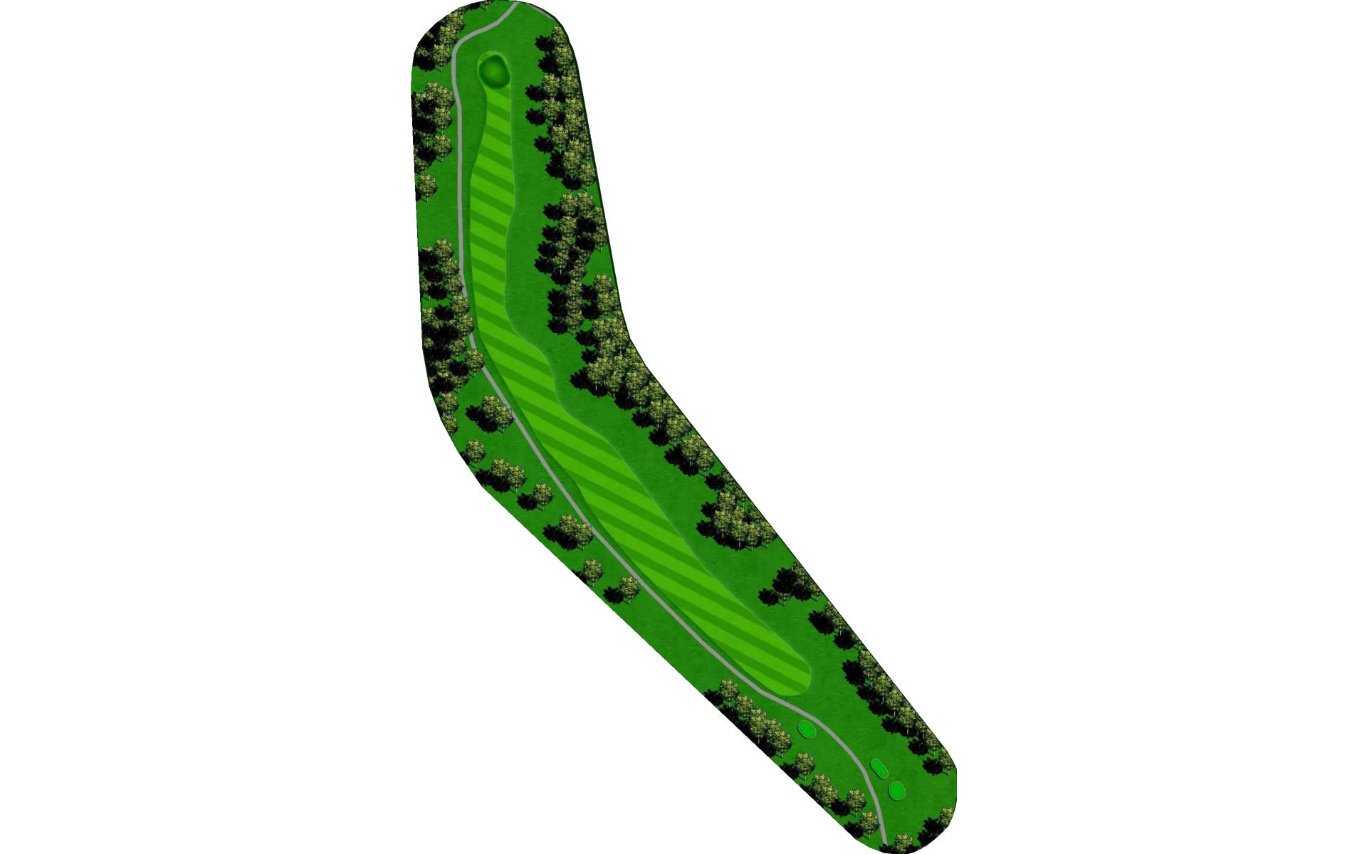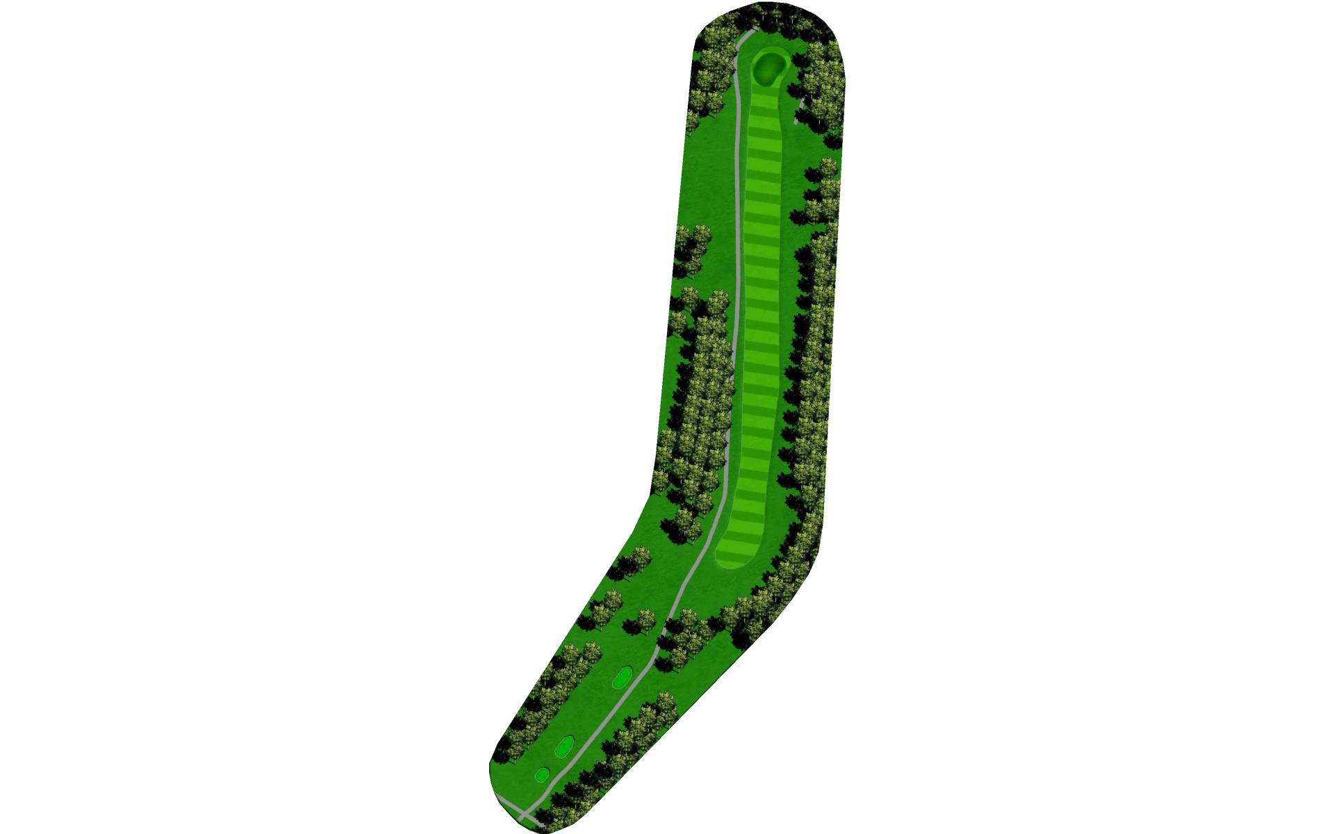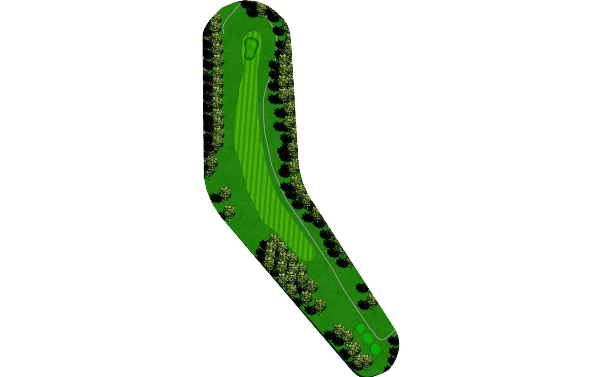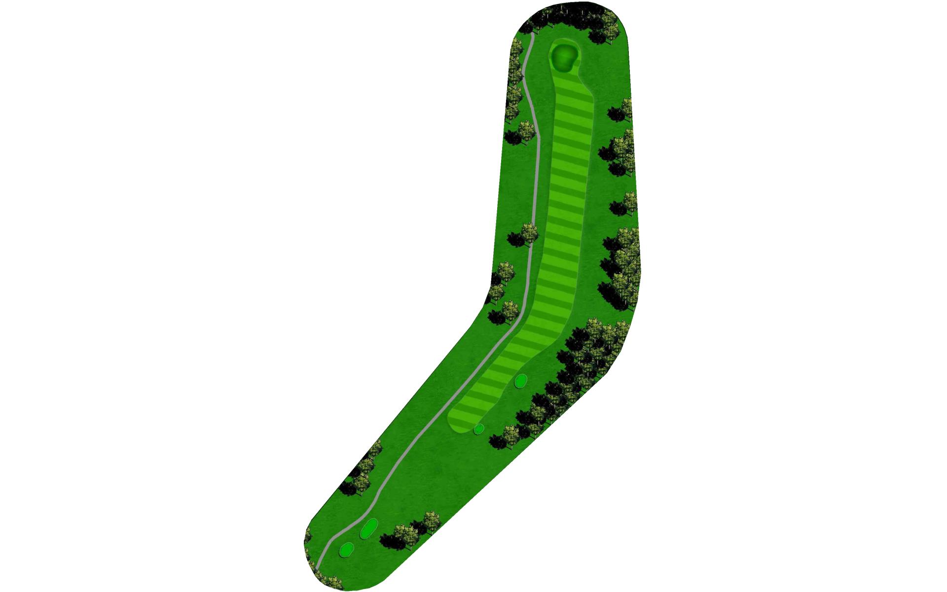 A 210 yd. tee shot straight away is the recommended play on this tight par 5. It is possible to shorten the hole by cutting the corner of the severe left dogleg, but it is not a smart play. Trees line the fairway on both sides, so accuracy is at a premium. The green is a small target for the approach shot, measuring only 15 paces deep.