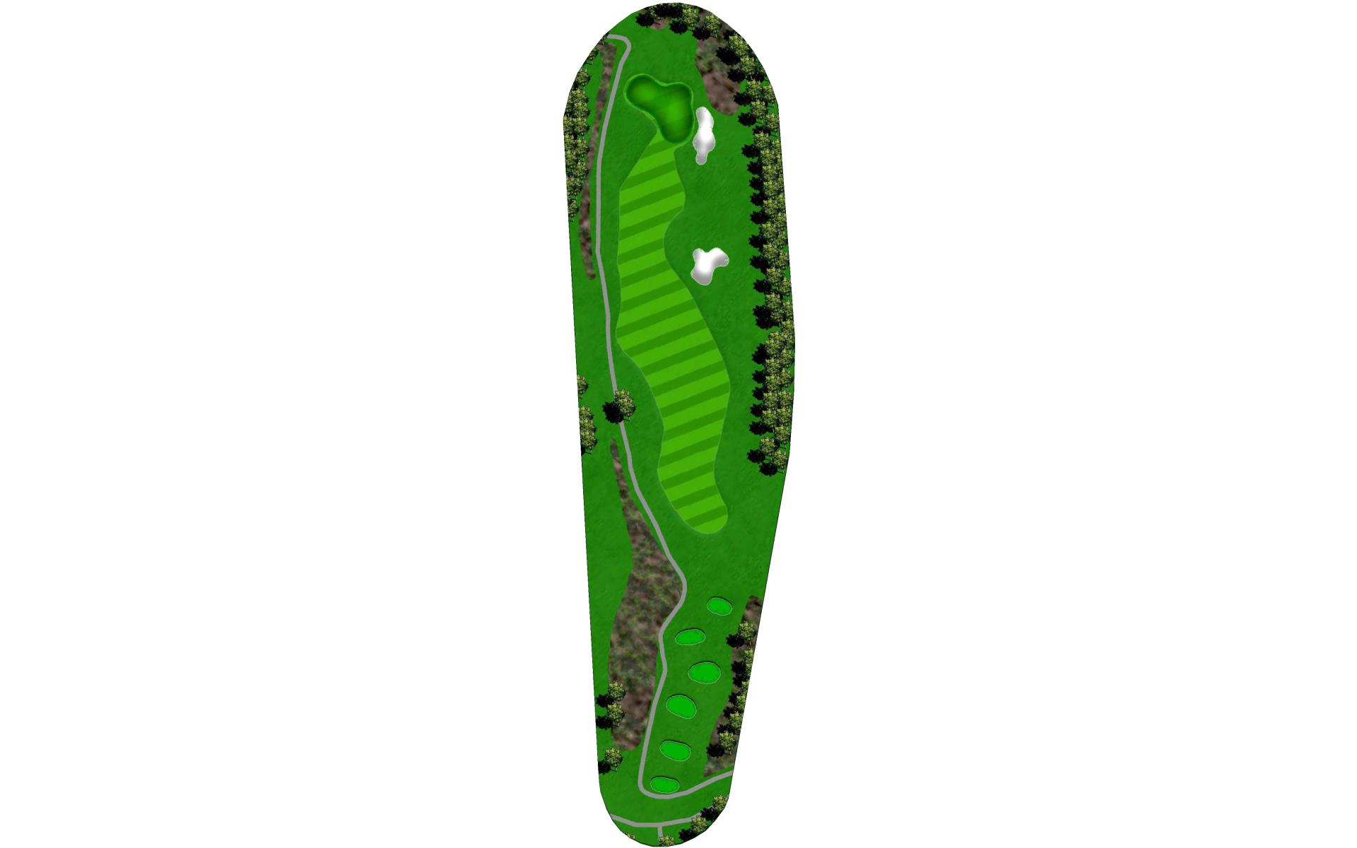 A big hitter can reach this short, downhill hole, but this hole isn’t as easy as it looks. There is out of bounds on the left, a penalty area on the right, of an elongated green with a steep slope separating the left side.