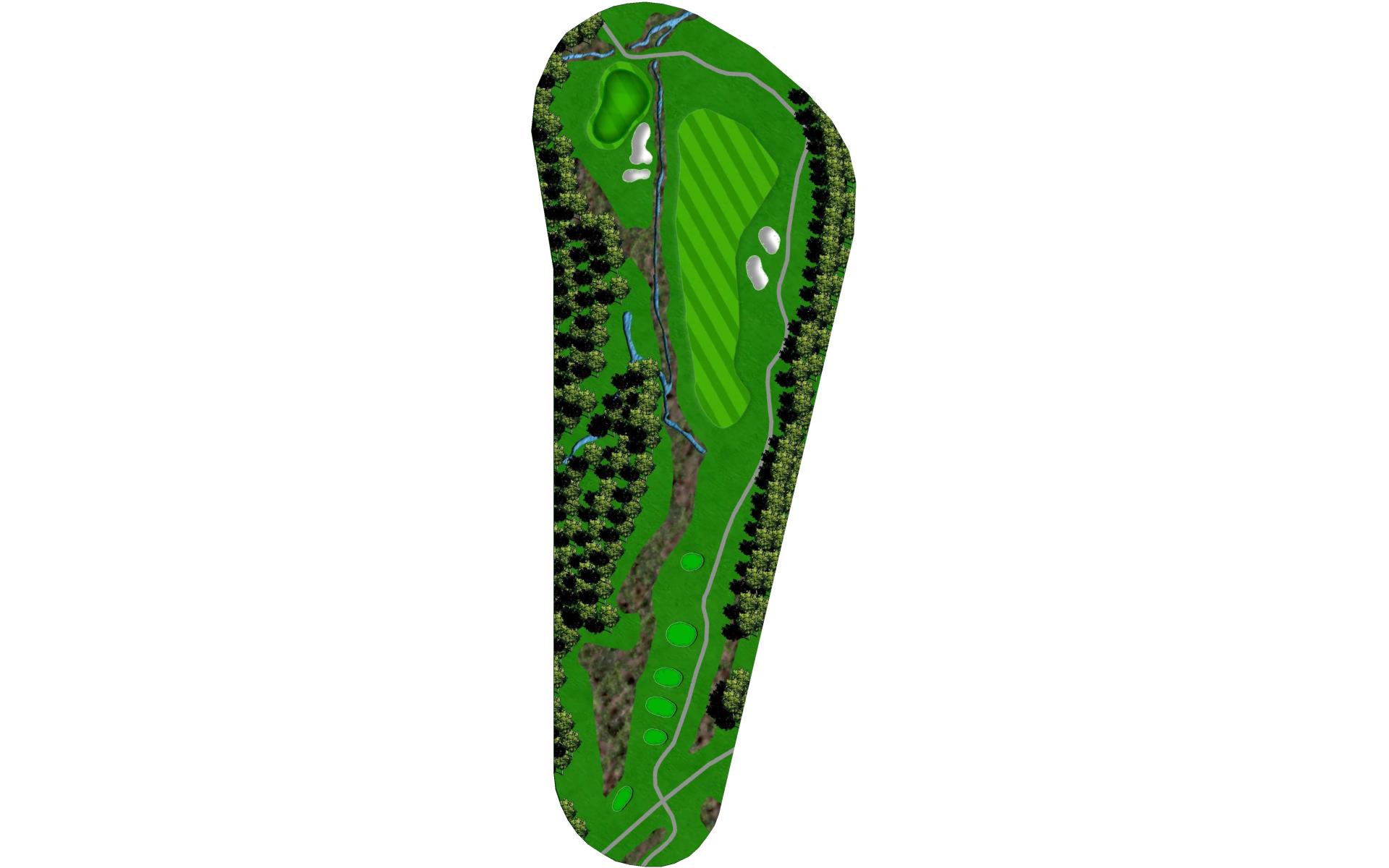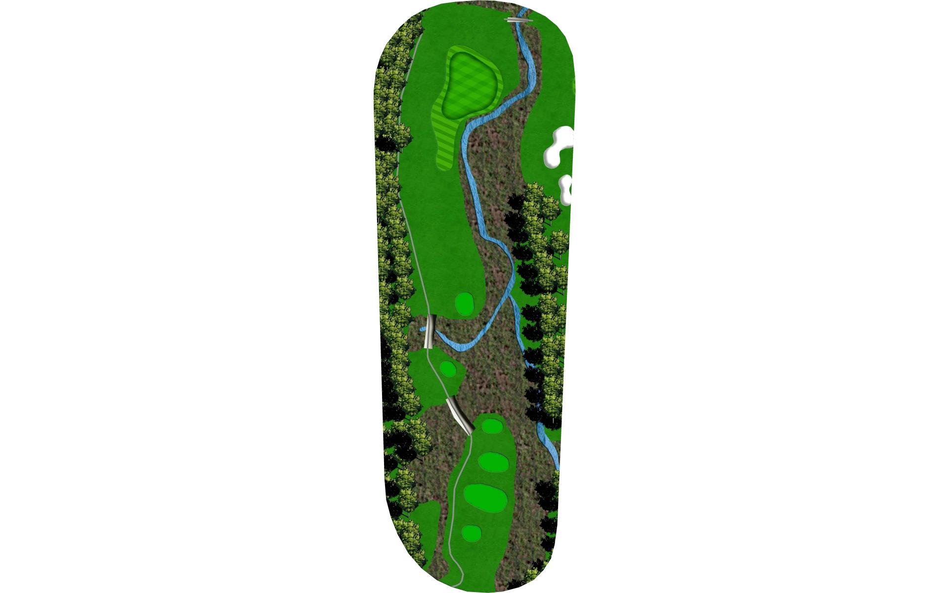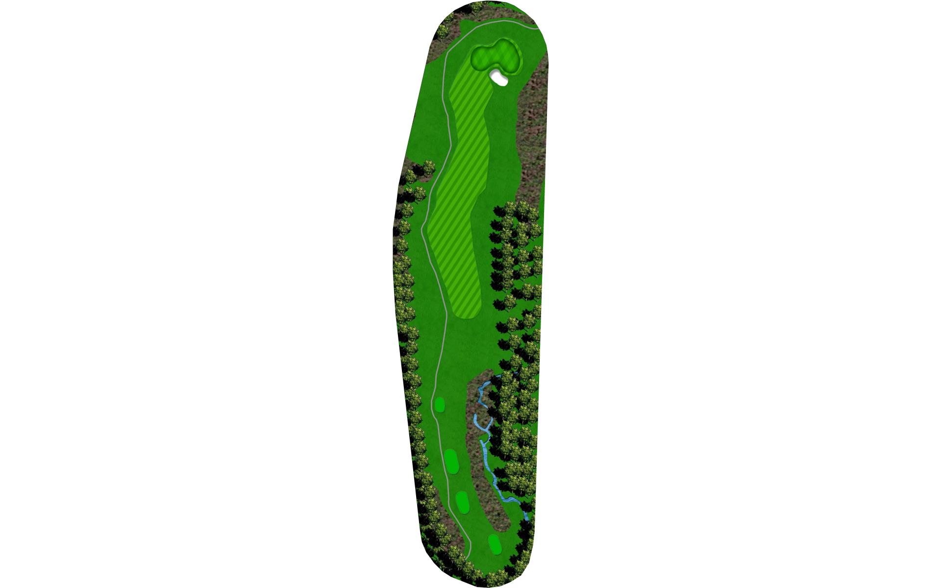 The green is big, which is good because there’s no place good to miss it. A stream and a marshy area guards the front, so it’s all carry. Right and short of the green is a penalty area. Left is a hillside that allows for bank shots but makes for difficult chipping. There is little room behind the green as well. The putting surface slopes dramatically from left to right, making it the toughest two-putt on this nine.