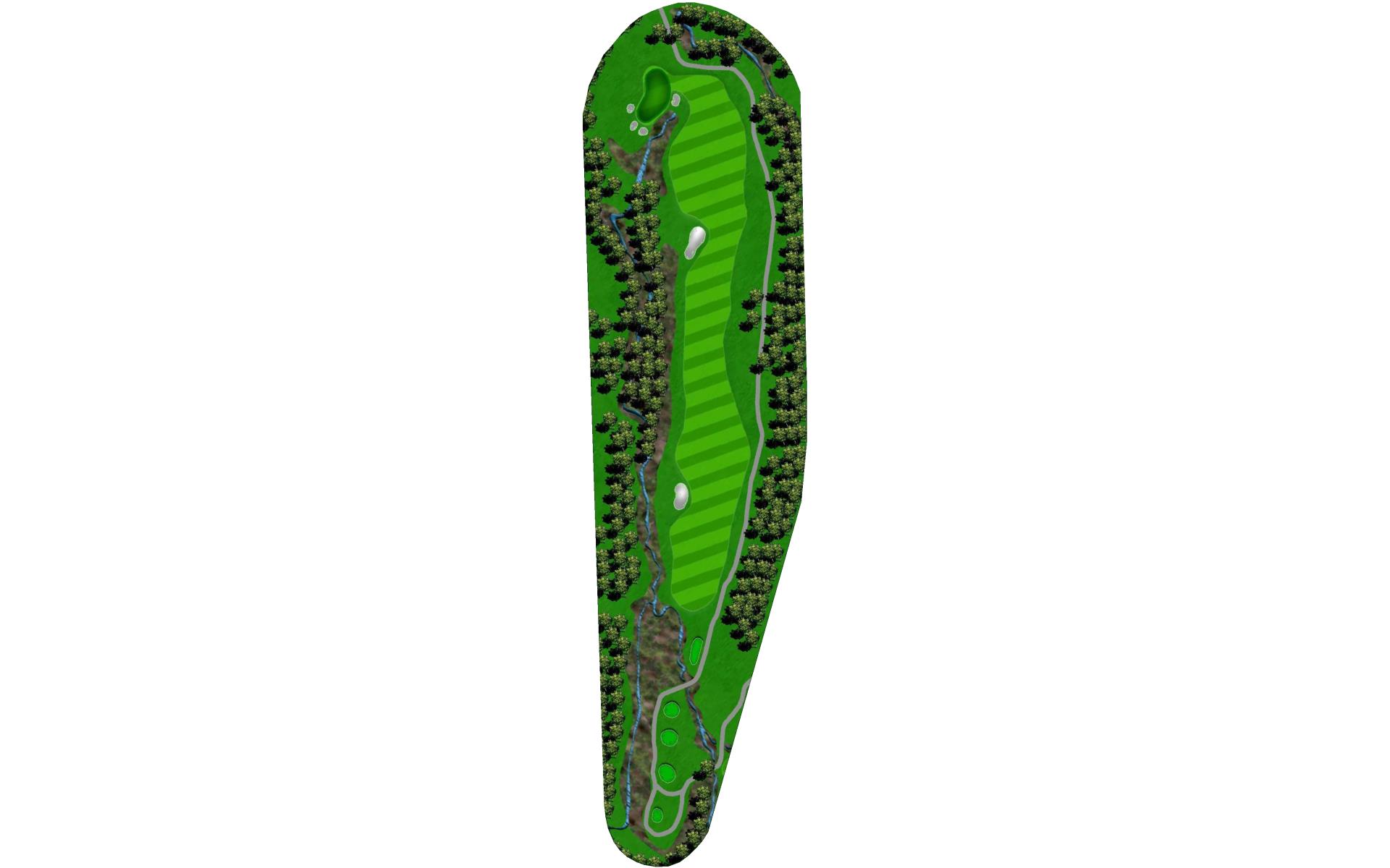You’ve got options on how to play this short hole. A stream guards the left side, cutting in front of the green, and two fairway bunkers guard the right. Lay up short of the bunkers for a short-iron in or hit a wood past them for a pitch shot in over the greenside bunkers. The hole location on the green, which is angled from back left to front right, may decide your strategy from the tee.