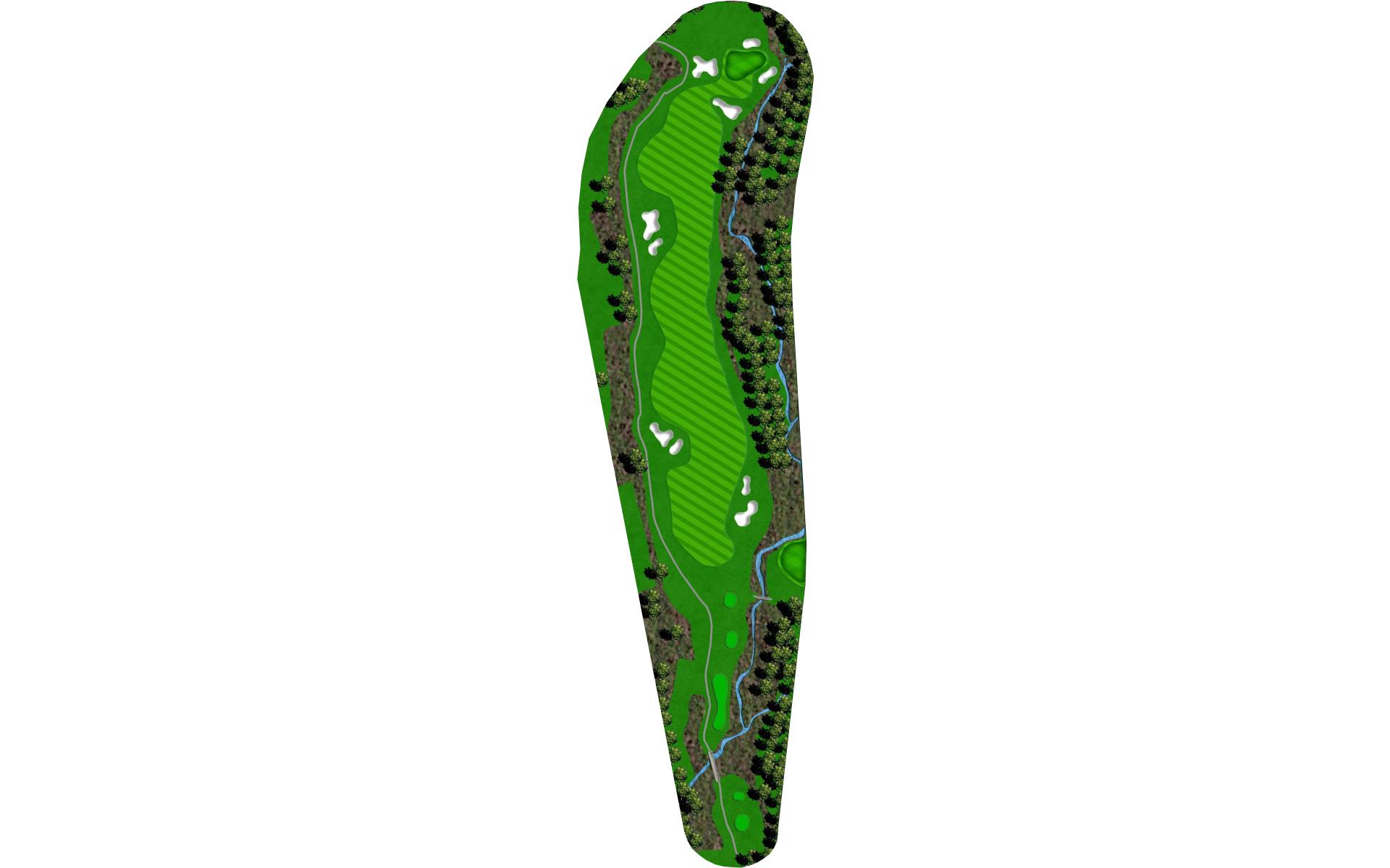 Finally, a roomy fairway to drive to on a true-risk reward hole, but with a penalty area left and out of bounds right, a well-placed tee shot determines your approach. A stream and a small ravine lie in wait short of the green’s left side, a bunker guards the middle, demanding a precise shot for those who dare to go for it in two. Those who lay up must first navigate the left fairway bunker then hit into a shallow but long (and sloped) green, not an easy shot.
